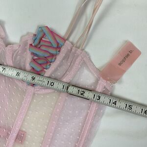 Adorable polka dot pink mesh lace corset top with rainbow corset details at bust. Adjustable rolled double spaghetti straps.