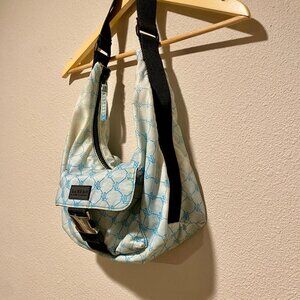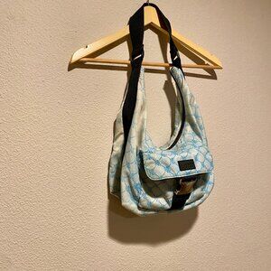 Add a nostalgic touch to your outfit with this vintage Y2K Ralph Lauren crescent bag featuring an all-over monogram print in blue and gray. While it shows signs of wear, it's a great statement piece with retro charm.