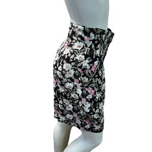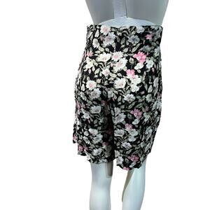 Gorgeous vintage Y2K era Rampage high-waisted shorts featuring a romantic floral print on a black background. When displayed on our size 6 mannequin, these shorts showcase their flattering silhouette with a paper-bag waist detail and relaxed fit through the leg. Perfect representation of the 90s/Y2K aesthetic.