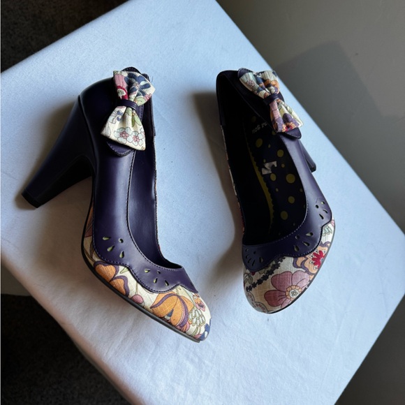 Statement purple leather heels with a rounded toe and adorable floral fabric bow detail. Features decorative cut-out accents, a cushioned polka-dot footbed, and a comfortable mid block heel. Fun, vintage-inspired style that adds personality to any outfit. #Retro #Vintage #Y2K