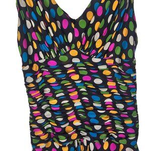 polka dot dress, silk dress, Bryan Bradley, colorful dress, party dress, sleeveless dress, V-neck dress, size 6 dress, elegant dress, vibrant dress, silk clothing, women's fashion, colorful, retro, y2k, fit & flare, artsy, girlhoodcore, coquette girl, twirl dress, occasion