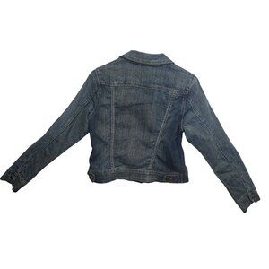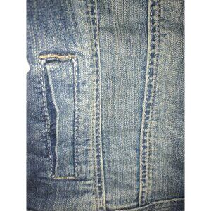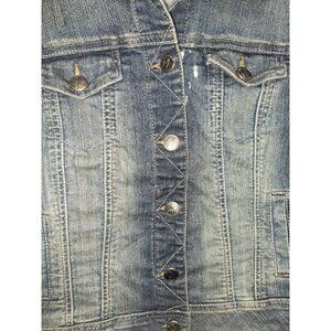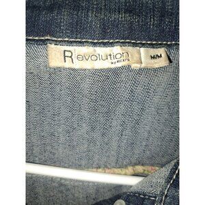 "Vintage-inspired *Revolution by Ricki's* denim jacket, perfect for layering and casual streetwear looks. This pre-owned medium-wash jean jacket features a classic button-front closure and two front chest pockets. Made from a comfortable blend of cotton, polyester, and spandex for just the right amount of stretch. Measurements: Bust 19 inches (flat lay), sleeve 25 inches, length 20 inches. Stylish and versatile, this jacket is an essential piece for any capsule wardrobe. Trendy, functional, and great for year-round wear."