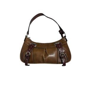 Chic Y2K-era Rina Rich brown shoulder bag, perfect for a nostalgic style moment. Features rich brown, possibly faux, leather with contrasting dark burgundy/ brown buckle straps and silver-tone hardware. The classic baguette shape and distinctive buckle accents make this a unique statement piece. Interior has a fun, subtle plaid lining. Excellent vintage condition with minimal wear. Zipper pull is marked "rina rich". A must-have for vintage lovers!