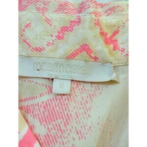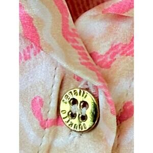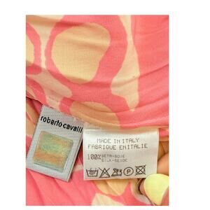 Early 2000s Roberto Cavalli silk blouse in a candy pink and champagne geometric print. Features ruched drawstring 3/4 length sleeves finished with adorable gold-tone charms. A flirty, luxurious piece from the golden era of Cavalli's career.
