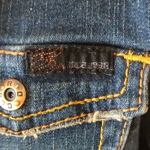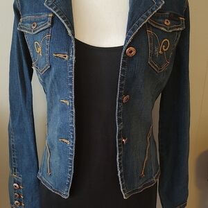 This vintage Rocawear fitted gold embroidered distressed blue denim jacket is a WOW on the Richter Scale!!! Excellent condition. Nice medium heavy denim that keeps its shape, double gold stitching throughout, three button sleeves, drop seat...how KOOL! No pockets. 17" pit to pit. 24" sleeve. 21" shoulder to hem.
