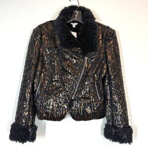 Stand out in this stunning Harlow Zee metallic black and gold plush faux shearling moto jacket. This eye-catching statement piece features a luxurious textured crocodile-inspired finish, soft faux shearling collar and cuffs, and gold-tone zipper details that add just the right touch of edge and sophistication. Listed as a Large (variation in tags, see below for fit guidance)