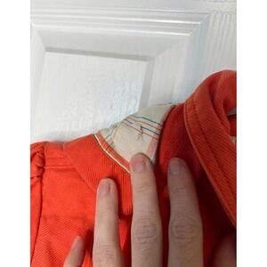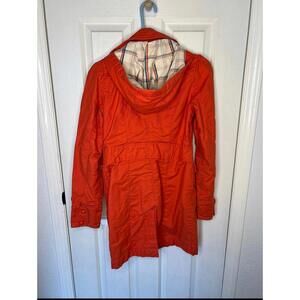 Orange Roxy trench coat with plaid lining. Very comfy soft canvas material. Has detachable hood. Small tear on side of the hood lining. Collar covers it. Size small