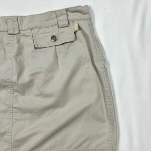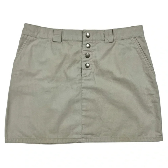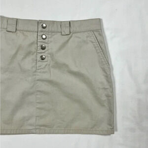 tan lightweight mini skirt with a snap button fly