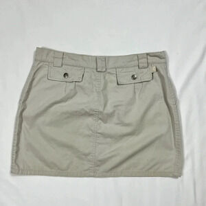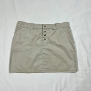 tan lightweight mini skirt with a snap button fly