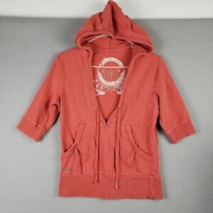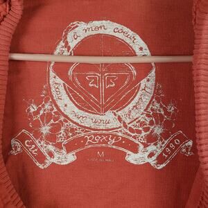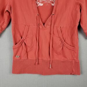 Y2K Roxy Size M Belle Swan Elbow Sleeve Hoodie Sweatshirt Orange V-Neck Pullover