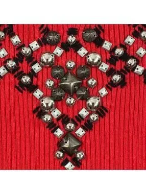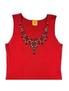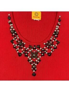 Ruby Rd. Red Ribbed Tank Top with Beaded V Neckline Elevate your casual wardrobe with this striking red ribbed tank top from Ruby Rd. The standout feature is the geometric v shaped neckline adorned with black beads and clear stones, adding a touch of sophistication to an everyday piece. Crafted from a comfortable rayon and nylon blend, the ribbed knit fabric offers gentle stretch and breathability, making it perfect for layering or wearing solo. The scoop neckline and embellished detailing make this tank a versatile choice for dressing up basics or adding visual interest to your everyday look. A timeless piece that bridges casual comfort with subtle glamour.