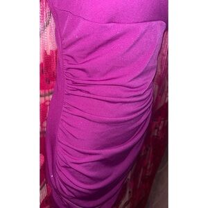 This elegant y2k sparkly fuchsia mini dress by Ruby Rox is designed with a ruched bodycon fit, perfect for a night out. The sleeveless style features a flattering cowl neckline, enhancing its chic appeal. Has a couple gems missing, but in overall great condition.