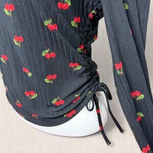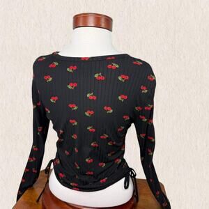 cherry print, ruched top, black ribbed, Y2K fashion, grunge style, indie vibe, adjustable ties, long sleeve, embroidered text, nostalgic