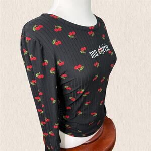 Rue21 black ribbed long sleeve top featuring an allover red cherry print and white embroidered “ma chérie” text at chest.