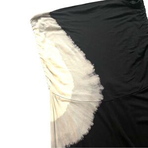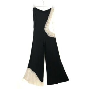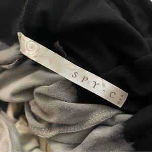 Y2K Spy-c Strapless Tie Dye Jumpsuit with wide, slightly flared legs. Black jersey jumpsuit is super stretchy and pulls on. Turn the top down for a wide waistband or a skirt-over-pants look. Hems have been trimmed to a 30” inseam.