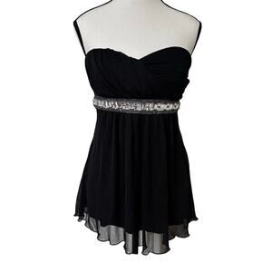 POLYESTER/SPANDEX. STRETY. Black strapless dress with rhinestone belt