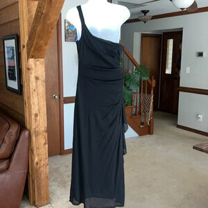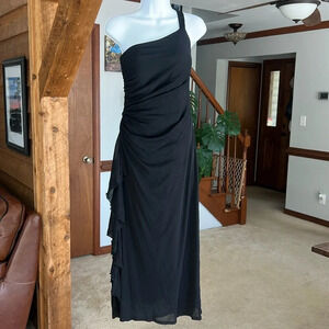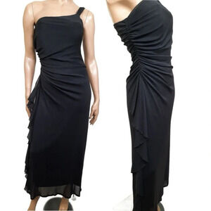 Y2K Sangria Black Ruched Dress Womens 10 Long Mesh One Shoulder Party Cocktail Long Dress with Mesh Ruffle Detail Down The Side. Does hit above the ankles. It’s stunning and a nod to the early 2000’s! Used excellent condition. Non smoking home. Pet friendly.