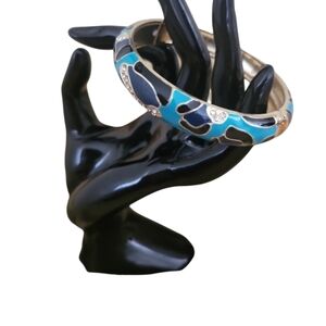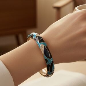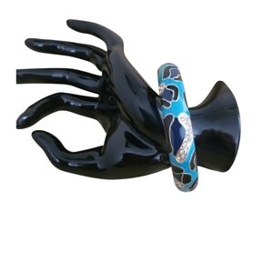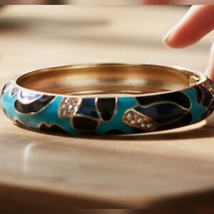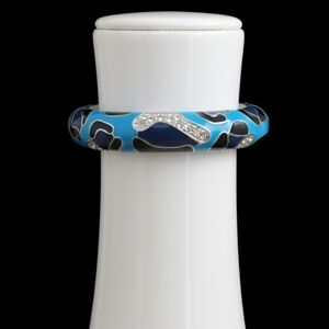 Authentic Sequin hinged bangle bracelet featuring glossy blue, navy, and black enamel in an abstract pattern, accented with sparkling rhinestone stations and finished in gold-tone metal.