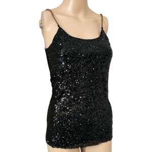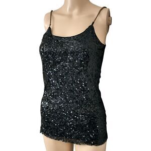 Y2K Sequin Fitted Top Chain Straps S Mesh Back Semi Sheer Black Sleeveless Disco. Condition is pre-owned and vintage early 2000s. The front is fully encrusted with sequins. The back is all mesh. The straps are chains... have some wear. The bottom is a raw edge. No stretch. No material or size tag. PLEASE SEE MEASUREMENTS!!