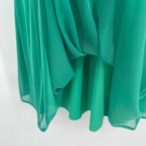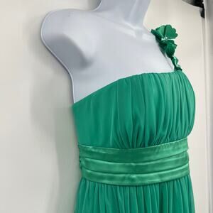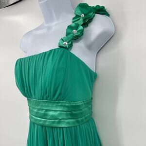 HoCo, Spring, Party, Milkmaid, Crystal, Pleats, Sash, Satin, Flower, Florette, Babydoll, One Shoulder, Sequin Hearts, green chiffon dress, one shoulder, bow back, party dress, prom dress, cocktail dress, bridesmaid dress, ruched bodice, floral strap, evening gown, junior formal, emerald green, romantic aesthetic, coquette, Y2K formal, homecoming, 2010s dress, sweet sixteen, spring wedding guest