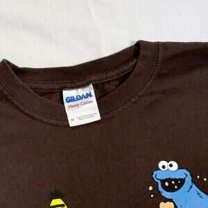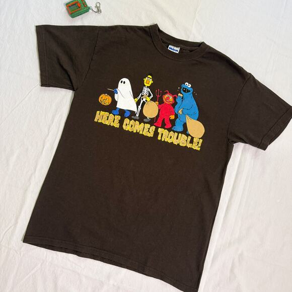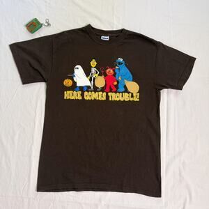 2000's Sesame Street Halloween tee in excellent condition, no flaws spotted. Graphic with Cookie Monster, Bert, Ernie, and Grover in costume. Chocolate brown colorway. 100% cotton.