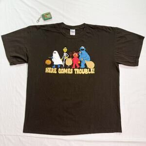 2000's Sesame Street Halloween tee in excellent condition, no flaws spotted. Graphic with Cookie Monster, Bert, Ernie, and Grover in costume. Chocolate brown colorway. 100% cotton.