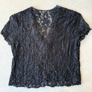 This little black lace number is pure late-90s attitude with its sheer floral pattern, satin-trim V-neck, and that perfectly cropped, slightly ruffled hem. The cut gives you that fitted, grungy silhouette that defined the alt-girl era—soft, moody, and hot without even trying. Pair it with cargos, chains, or a denim mini and you’ve basically stepped straight out of a 2001 downtown street shot. *AI modeled cover photo for styling fit and reference only Very good pre-loved condition with no flaws and general signs of wear. • Era: 1990s 90s • All tags have been cut - best fits S/M • Measurements Taken Flat: (Material very stretchy) • Bust: 17" • Length: 19" Are you new to Poshmark? Join Poshmark with our referral code JAZZYMOONSTYLES for a $10 credit that you can use for purchases.