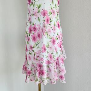 In excellent vintage condition, a late 90s/Y2K era bias cut midi dress by She’s The 1. Features a white base with allover pink floral and butterfly print, bias cut body, sleeveless tank neckline, and double layer ruffle hem.