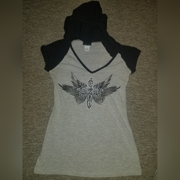 Has a super cool black hood attached this shirt is amazing!
