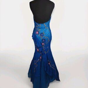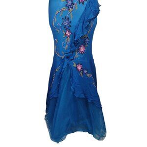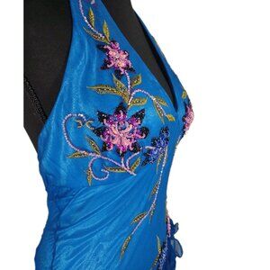 Y2K Silk Beaded Peacock Blue Maxi Halter Dress Floral Prom Formal Sexy - M Fairy