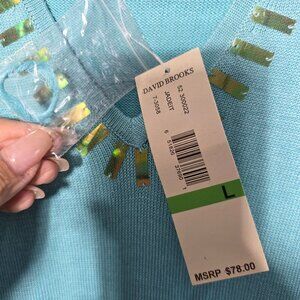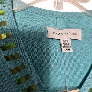 Silk blend women's V-neck sweater with green metallic embellishments, long sleeves, and lightweight textured fabric.