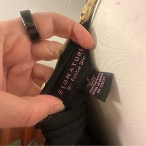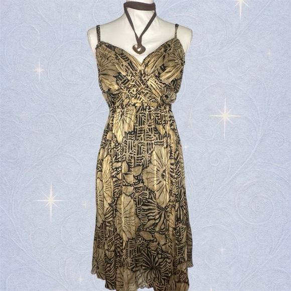 Stunning 100% silk boho-inspired midi dress by Signature Robbie Bee, size 6. Features a ruched bust with sweetheart neckline, adjustable spaghetti straps, and a gorgeous earth-tone tropical leaf and abstract print in tan and black. Fitted empire waistline flows into a breezy asymmetrical hem. Fully lined with side zip closure and waist tie for a flattering fit.