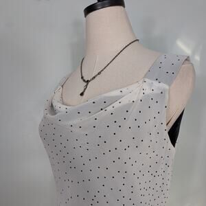 Sleeveless, chiffon, cowl neck, bias cut, polka dot and zig zag print with glam, artsy, indie, eclectic fairy, and grunge vibes.