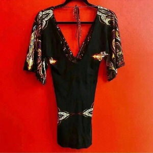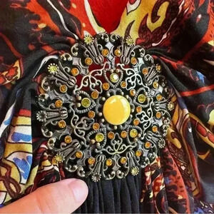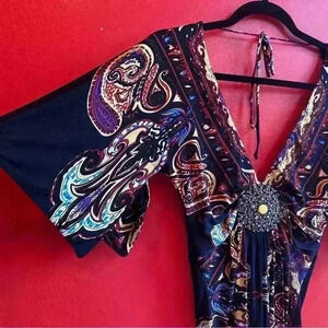 Y2K 100% Silk multicolor kimono sleeve tunic top size Medium. V neckline and ties in the back. Front has a metal medallion with yellow/gold rhinestones (there are a couple missing). Very light piling which could not be captured on camera, it is very minor. Has a low, U shape back. Does have stretch.