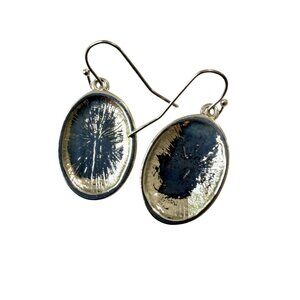 These vintage Ear Sense silver tone oval dangle earrings feature a beautiful swirling filigree and dot pattern against an oxidized background that highlights their elegant detailing. Their timeless, artisan-inspired look makes them perfect for both casual and dressy occasions.