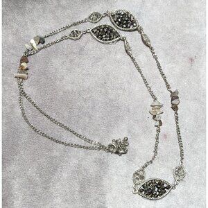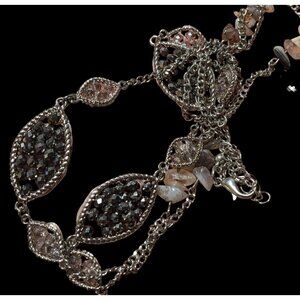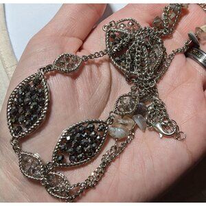 This Y2K Silver Glass Gemstone Chip Station Necklace is a vintage piece with a modern twist, perfect for adding a touch of sparkle to any outfit.
