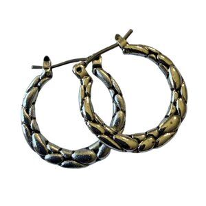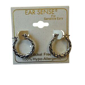 These vintage Ear Sense silver tone hoop earrings feature a bold textured design reminiscent of pebbles. Measuring approximately 3/4" in outer diameter, they’re the perfect balance of subtle and stylish—ideal for everyday wear or pairing with your favorite vintage pieces.