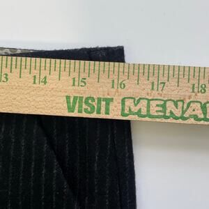 Details: Beautiful bell bottom silhouette that hugs the curves. Material is soft wool which helps keep warm in colder climate while still being breathable. Has two front pockets, back pocket is not real. Color is a very dark grey (almost appears black) with light grey, thin pinstripes.