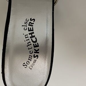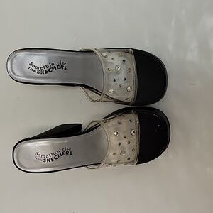Something else from Sketchers platforms. clear plastic upper studded with rhinestones. 5" chunky heel, 1" platform. sz 7. some of the black around footbed is starting to peel (pictured). (S2-005)