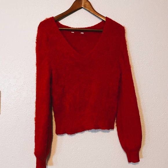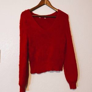 Y2K Soft Red Cropped V-Neck Mohair Pullover Sweater Size Medium