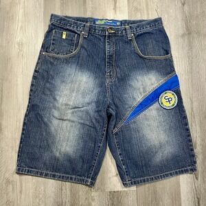 Y2K Southpole Blue Stripe Embroidered Size 38 JNCO Style Denim Jean Shorts