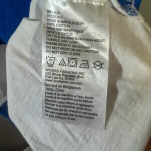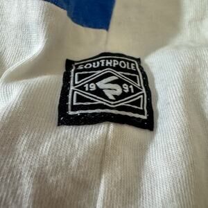 This is an authentic and striking graphic T-shirt from the Southpole Authentic Collection, a brand rooted in 90s and Y2K streetwear. The shirt features an eye-catching all-over horizontal stripe pattern in bright blue and white. The focal point is a large, high-quality embroidered/felted NASA "meatball" logo placed centrally on the chest. A woven patch near the hem proudly displays the "SOUTHPOLE 1991" founding date, linking the piece to the brand's iconic era (MCMXCI is Roman numerals for 1991). Made of 100% cotton, this shirt offers a relaxed fit typical of late 90s/early 2000s street style.