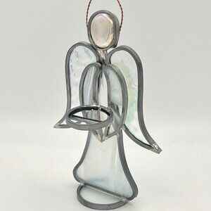 Y2K Stained Glass Angel Tea Light Candle Holder Iridescent Glass Signed Handmade