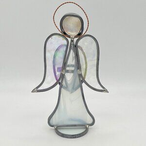 Vintage 2001 handmade stained glass angel candle holder featuring iridescent opalescent glass, copper wire halo, and signed artisan mark.