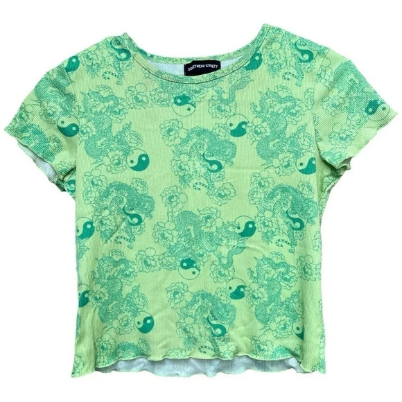 Y2K Streetwear Society Green Fitted Yin Yang Dragon Lotus babydoll cropped tee L