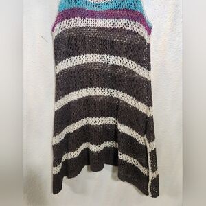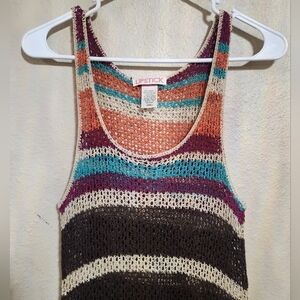 Channel serious retro vibes with this super cute Y2K-era knit tank top by Lipstick. Features multicolor horizontal stripes in shades of brown, cream, rust, teal, and plum for that perfect throwback look. Lightweight, semi-sheer crochet knit with a flattering scoop neckline and relaxed fit – ideal for layering or wearing solo on warm days.