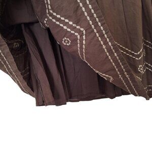 midi-length, pleats at the waist and a slightly flared silhouette, includes an inner lining. The decorative stitching at the hem consists of a repeating geometric pattern in white thread, adding a touch of detail to the garment