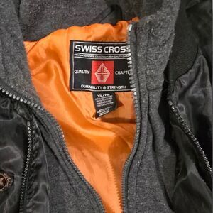 Swiss Cross Layered Hooded Bomber Jacket. Measurements pictured, tagged XL