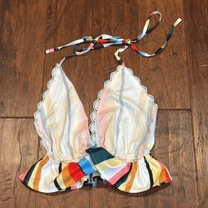 Vibrant halter top featuring multicolor stripes and delicate lace trim. Perfect for a bold, stylish look. From a Boutique, new condition! 35% Cotton, 65% Polyester.