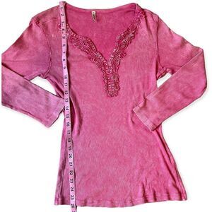 Y2K Taryn Taylor Ribbed Pink Stone Washed Embellished V-Neck Top